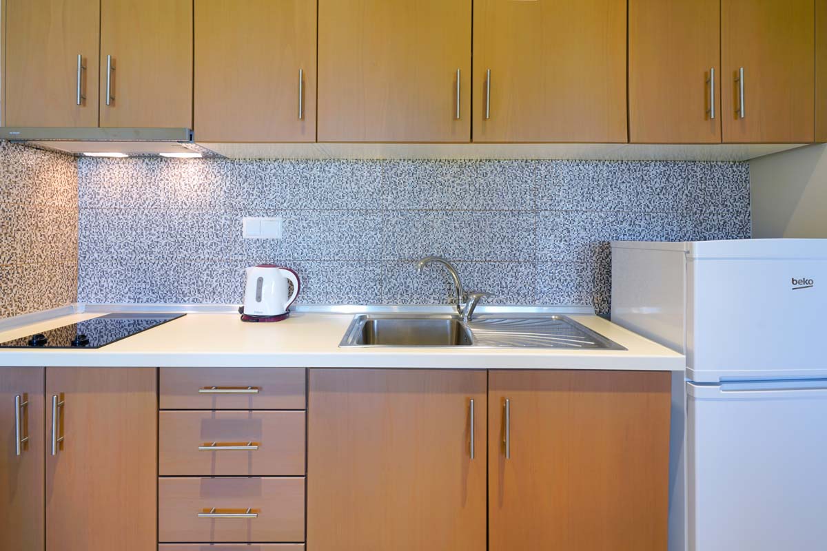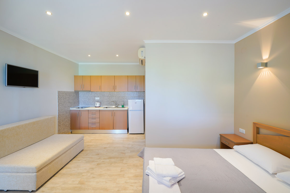 This studio features a cozy double bed, a comfortable sofa-bed, and a well-equipped kitchenette complete with a refrigerator and various kitchen utensils. The modern en-suite bathroom features a refreshing shower and the studio also offers direct access to a private furnished balcony where you can relax and enjoy the beautiful view.